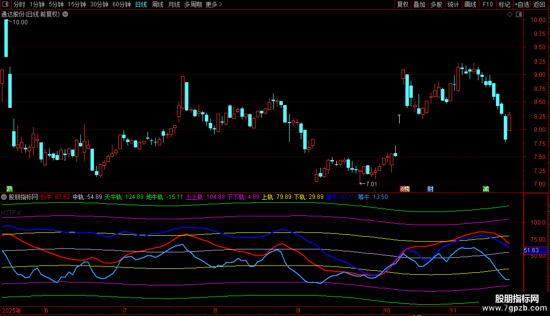 1. 彩线寻牛将量牛和价牛分别用彩色线表示,包含变化上下轨,彩线结合运用交叉形成彩线寻牛指标;