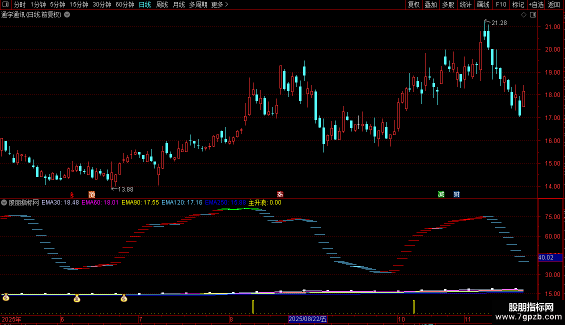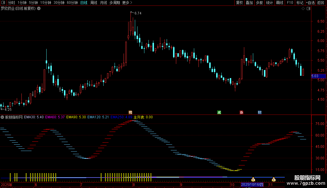 主升浪:IF(WINNER(C*0.9)*100-V/CAPITAL*100>=25,10,0),COLORYELLOW,POINTDOT;