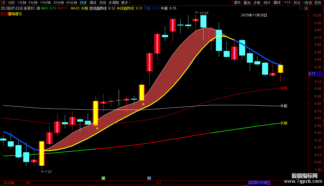 指标通过计算多周期加权均价形成短期和中期趋势线,结合乖离率和动量指标识别买卖点。当短期趋势线上穿中期趋势线且动量指标转强时买入,下穿时卖出;同时参考长期趋势线和牛熊分界线判断大方向。
