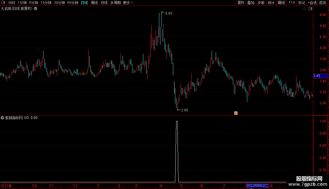 VAR21:=EMA(IF(L<=LLV(L,30),VAR20/2+HHV(VAR20,30),0),3)/618;