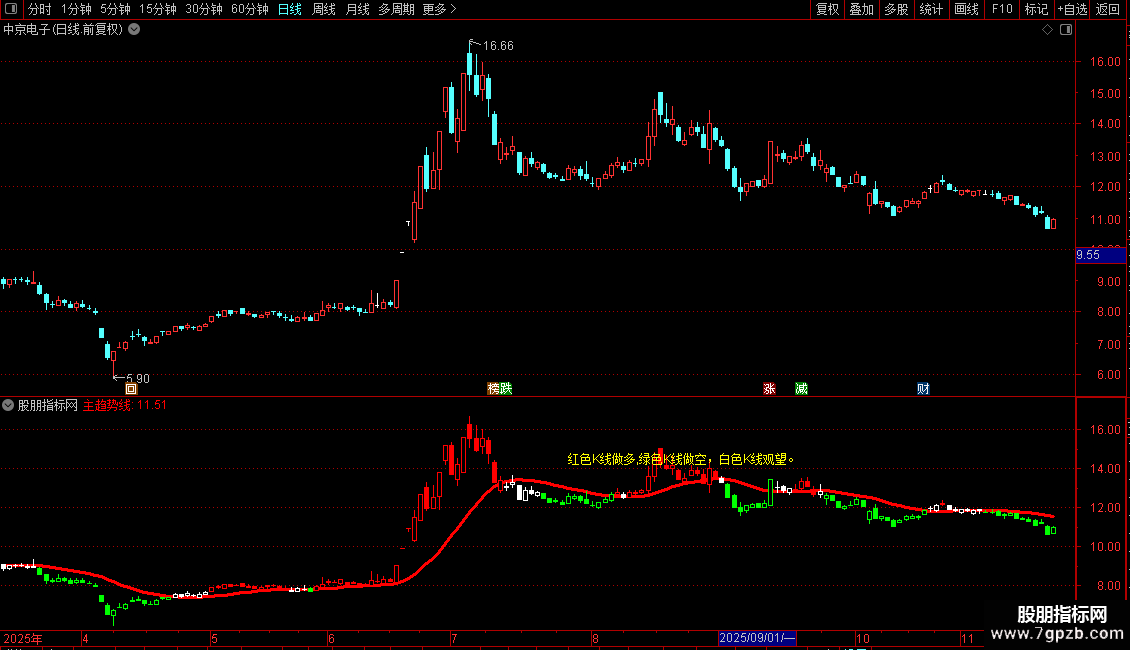 DRAWTEXT(C AND CURRBARSCOUNT=80 ,AAA, '红色K线做多,绿色K线做空,白色K线观望。 '),COLORYELLOW;