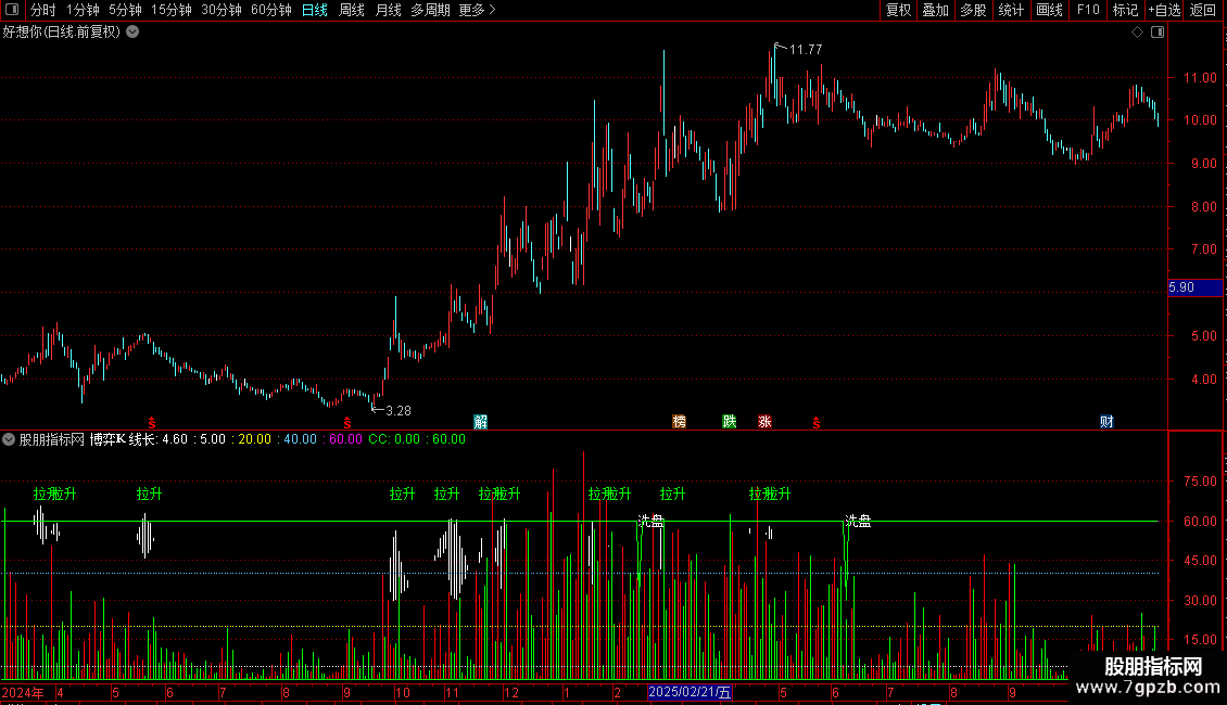 STICKLINE(收<=REF(收,1),0,博弈K线长,0,0),COLOR00FF00;