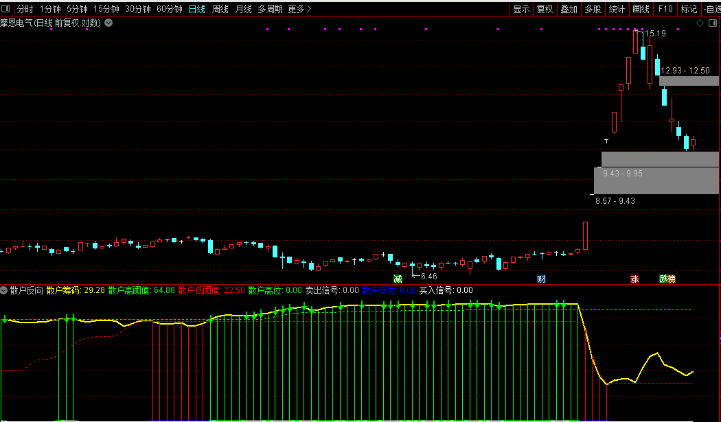 散户反向指标副图工具专为解决散户“一卖就涨一买就跌”的痛点设计,操作时可参考以下核心要素:黄色曲线(散户筹码线)实时反映散户在当前价格附近的持仓密集程度;绿色虚线为近60日散户筹码高位参考线(95%阈值),红色虚线为近60日散户筹码低位参考线(105%阈值)。当出现红色背景区域时,表明散户筹码处于极低水平,可视为潜在买点区域;绿色背景区域则显示散户筹码处于极高水平,对应潜在卖点区域。具体信号标识方面,↑图标代表满足“散户割肉+缩量阳线”条件,触发反向买入信号;↓图标代表满足“散户追高+滞涨或放量”条件,触发反向卖出信号。该指标无未来函数,保持原始数据真实性,适合短线交易者作为辅助参考工具。