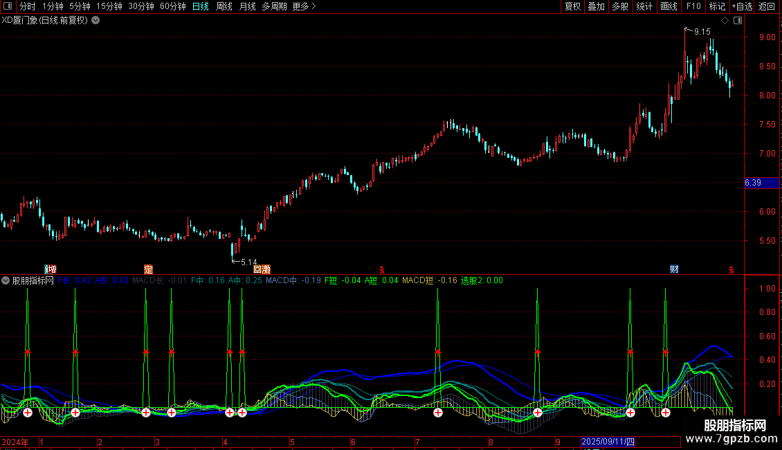A中:EMA(F中,9),COLORLICYAN,LINETHICK1;
