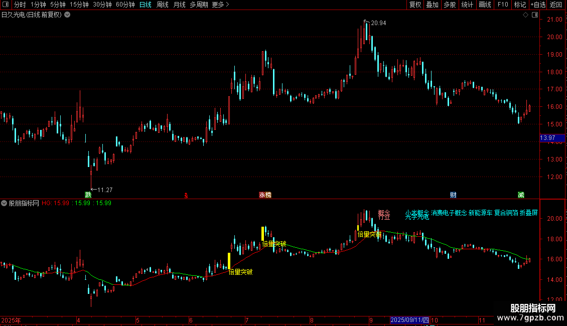 指标通过识别历史高点位置,结合成交量异动和价格突破行为,在K线图上标记买入信号点,并显示行业概念信息辅助决策。