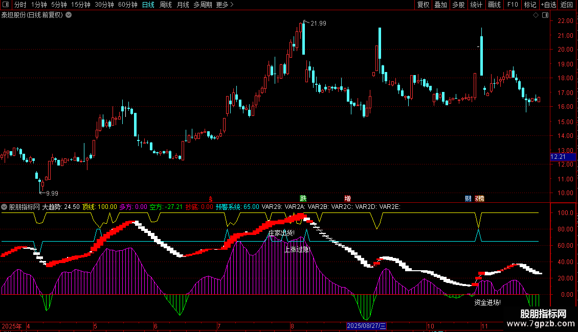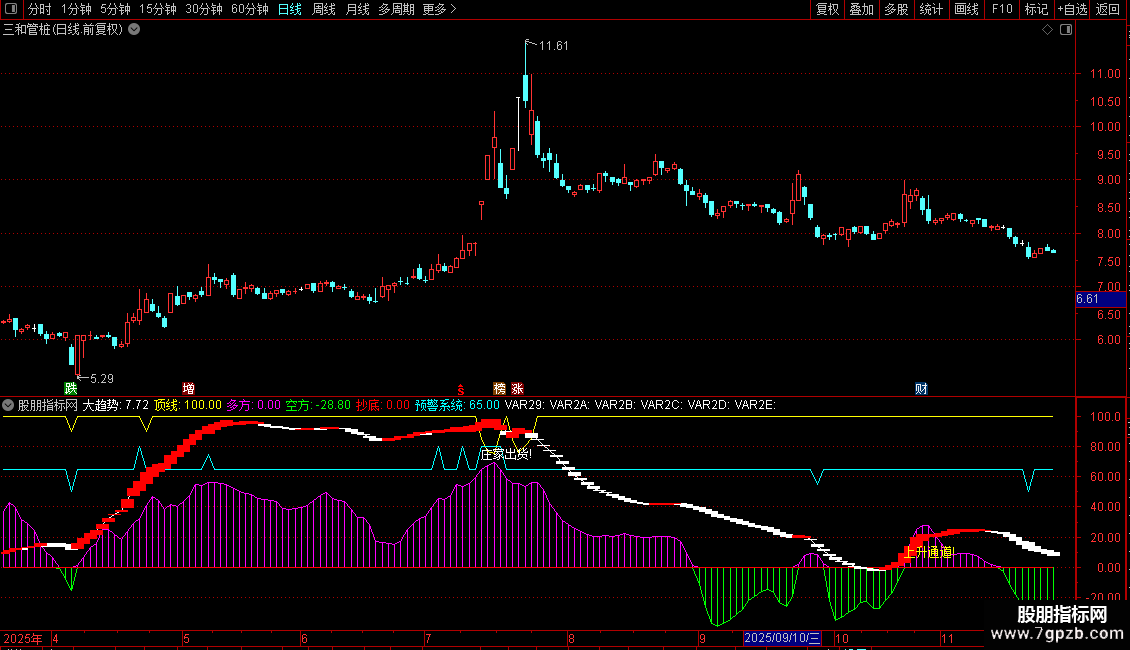 预警系统: IF(VAR7>=200 AND VAR6>=150 OR CROSS(65,多方),15,IF(VAR7<=-200 AND VAR6<=-150,-15,VAR9))+65,COLORCYAN;