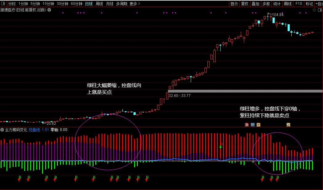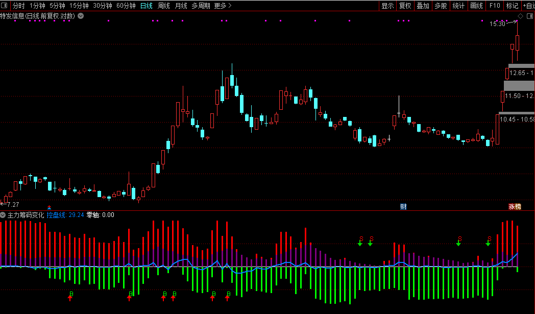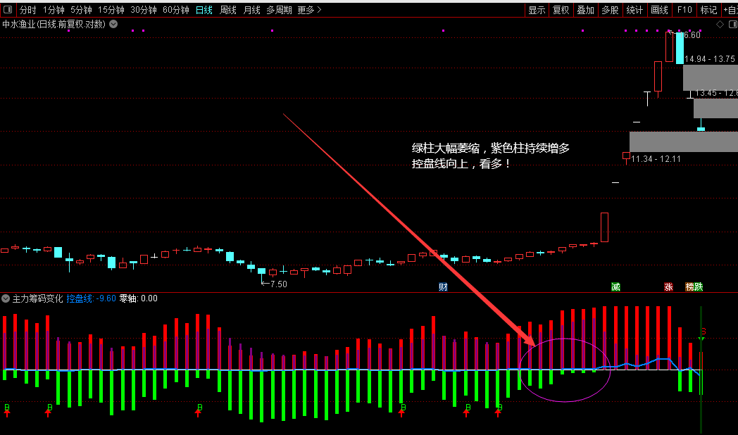 3、紫线突破前高表示筹码集中度提升,主力控盘增强