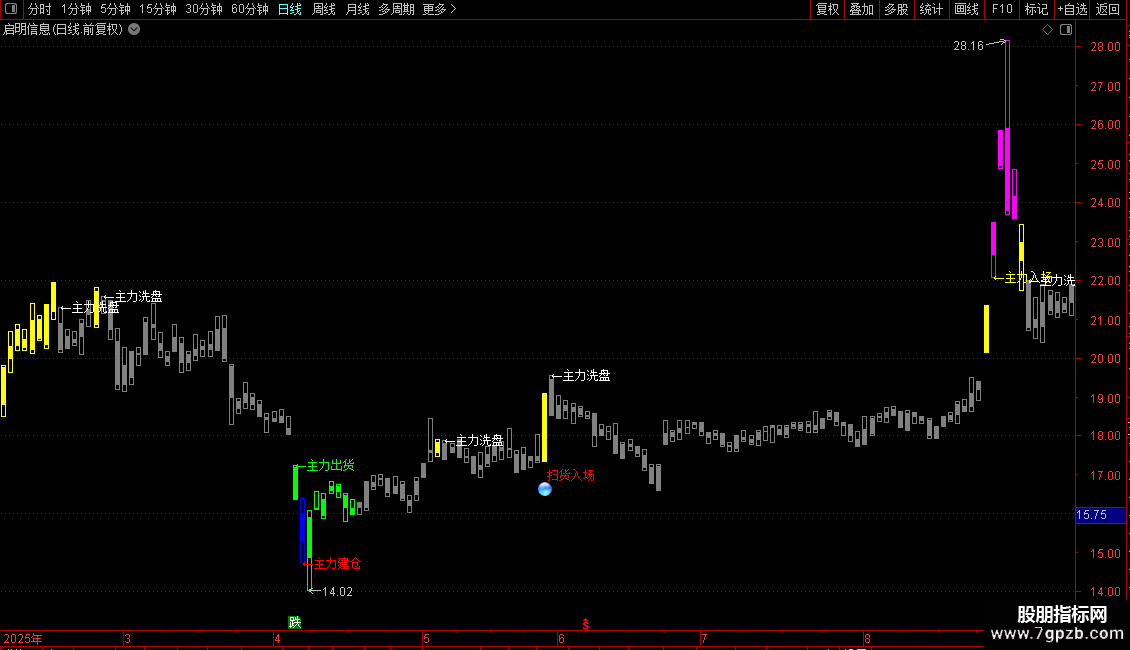 1.主力扫货入场主图指标包含扫货入场信号、主力入场、主力建仓信号和出货信号,当K线变为绿色时表示已经进入下跌趋势,灰色K线表示不温不火一般不考虑,黄色K表示进入上升通道。