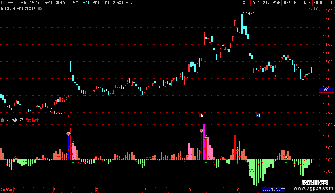 指标通过计算价格与成交量的多维度关系,结合超买超卖判断和强度变化识别交易机会。主要功能是监控价格偏离均线的程度、量价配合状态以及市场强度变化,用彩色柱状图和图标直观显示买卖信号。