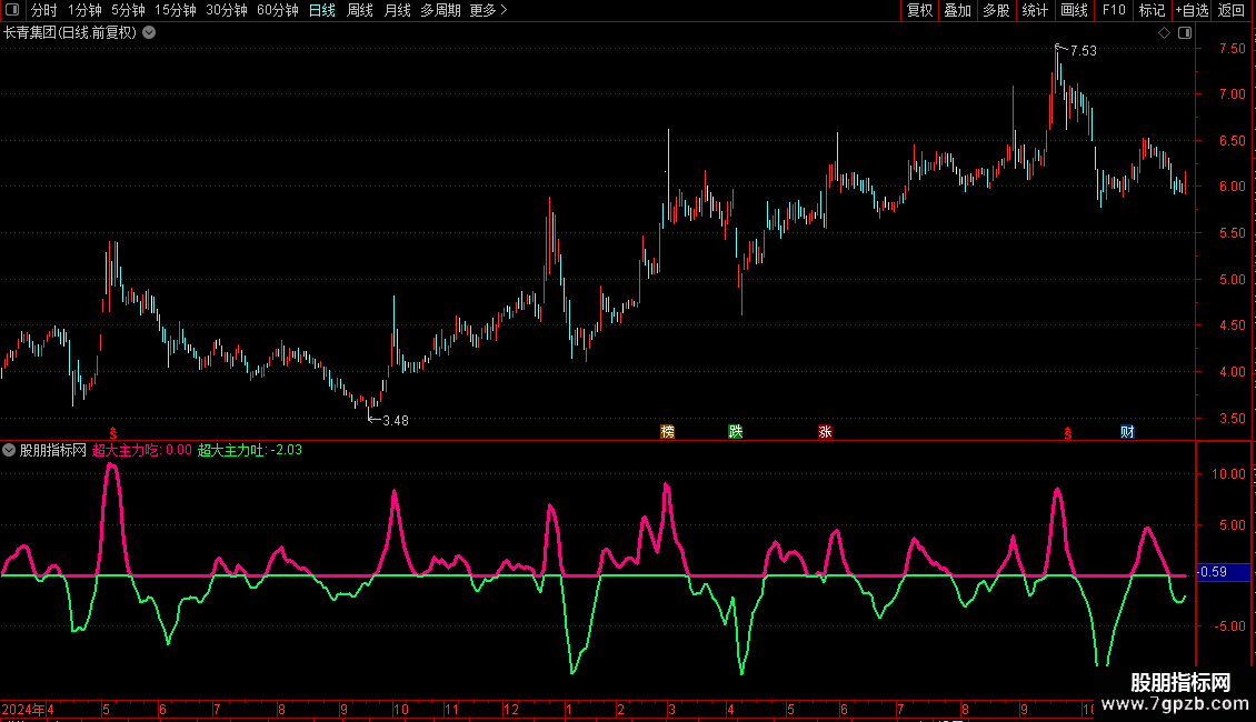 超大主力吃: IF(V4>=0,V4,0),COLOR7F00FF,LINETHICK3;
