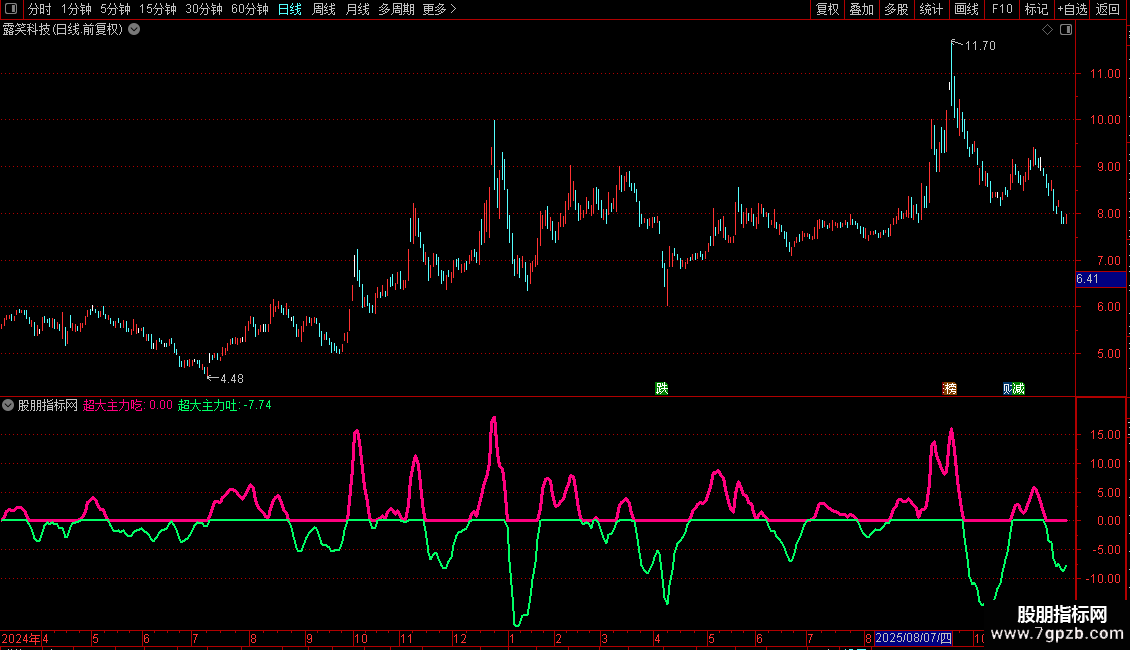 超大主力吐: IF(V4<=0,V4,0),COLOR66FF00,LINETHICK2;