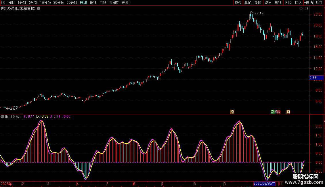 KDJ因其快速响应的特点而受到普遍应用,其指标设计因包含了最高价、最低价和收盘价,故从理论上来说比MACD携带更多信息,但其自身所蕴含的先天缺陷使其容易出现高位和低位钝化,并且KDJ自身频繁交叉易产生虚假交易信号,斯蒂芬超级KDJ从原理入手,有效消除了传统KDJ易高位钝化、交易信号频繁的缺陷,并将KDJ金叉的准确率提高了大约4%,更重要的是,斯蒂芬超级KDJ本身成为了一个正向盈利的策略。另外给出创业板4037点时的斯蒂芬KDJ的有效顶背离图形,供各位股友参考。