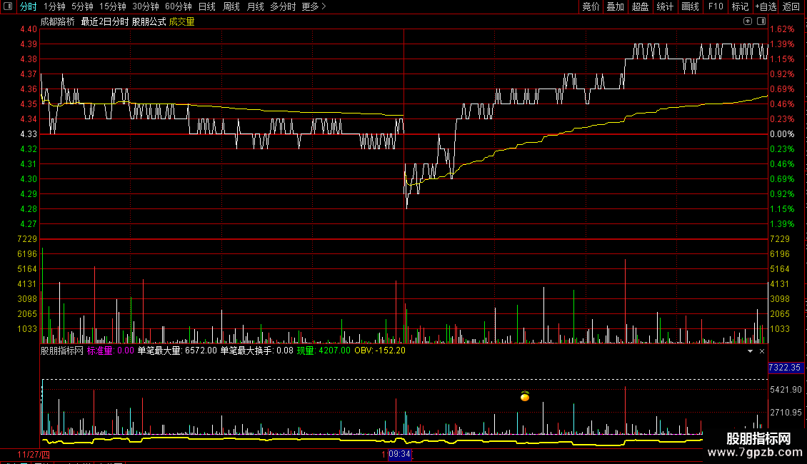 输出OBV:如果收盘价=1日前的收盘价,返回0,否则返回VA的历史累和,画黄色,线宽为2