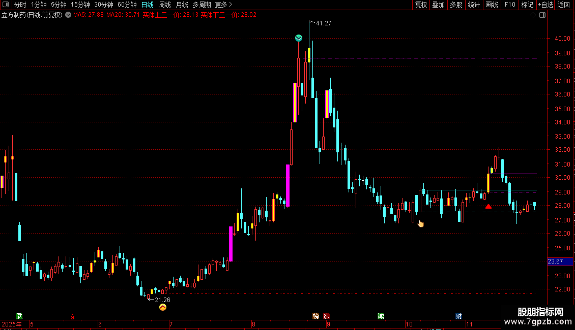 1. 量柱标记系统:自动标记20日及100日内高量柱、低量柱关键位,以紫色/青色柱体及图标清晰标注