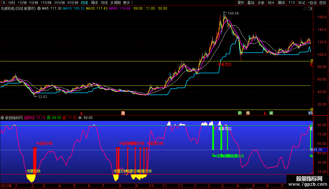下单卖出:STICKLINE(DD=1 AND C>地量反转,89,50,5,0),COLORGREEN;