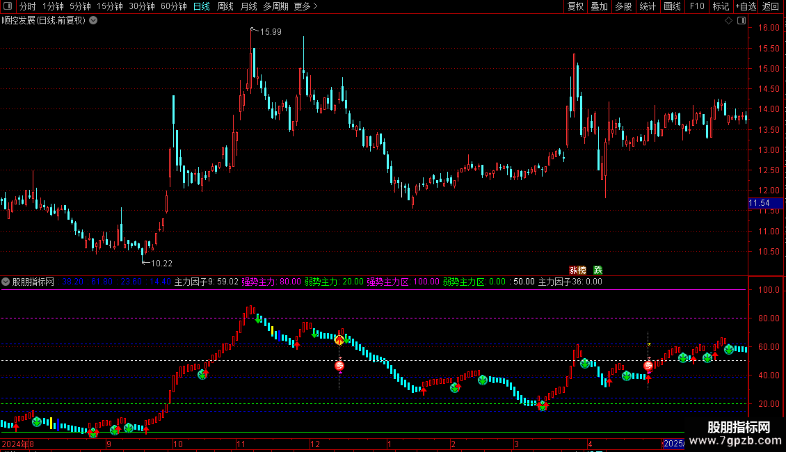 指标通过计算价格在特定周期内的相对位置来判断主力资金动向。核心功能是识别主力控盘状态转换的关键节点,当指标从弱势区突破至强势区时产生买入信号,从强势区回落至弱势区时提示风险。