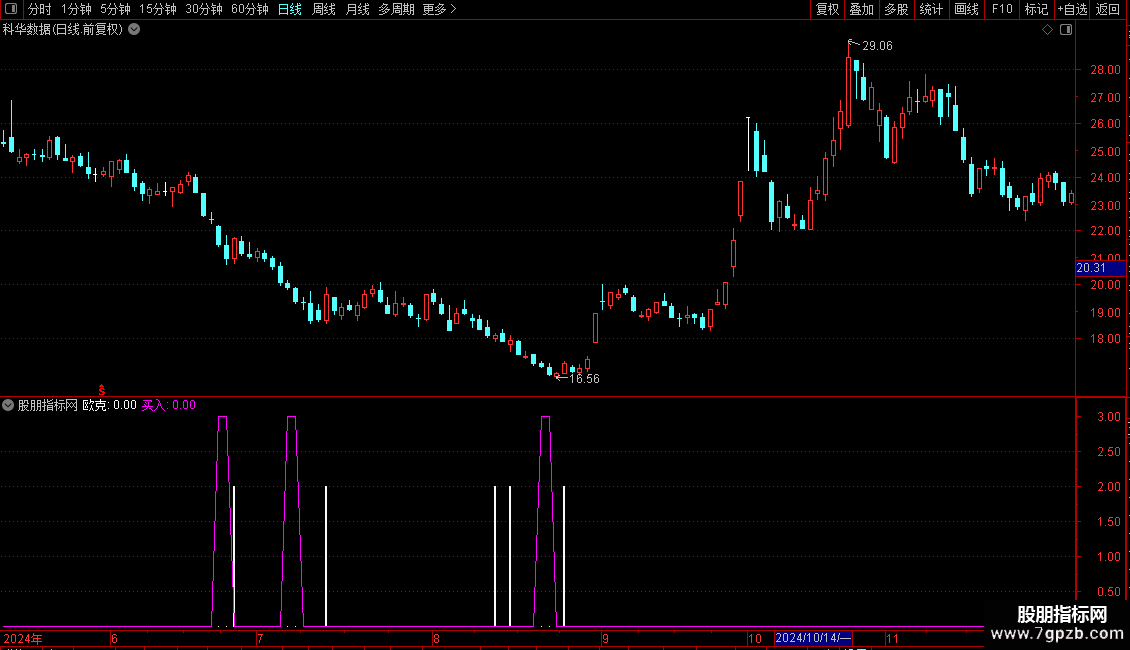 买入:IF(((KDJ<0)&&(RSI<20)),3,0),COLORMAGENTA;