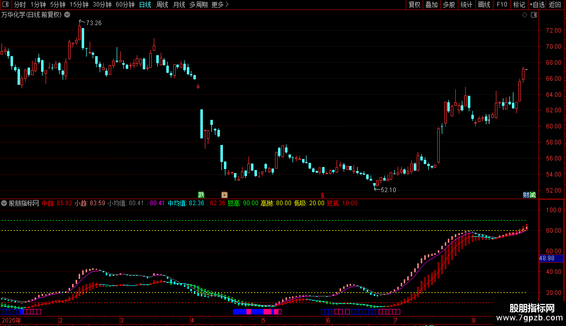该指标构建了中期与短期两套轨道系统,通过颜色变化直观显示动量方向。当价格处于历史区间两端时给出明确警示,结合均线变化捕捉趋势转折点,实现多维度波段机会识别。