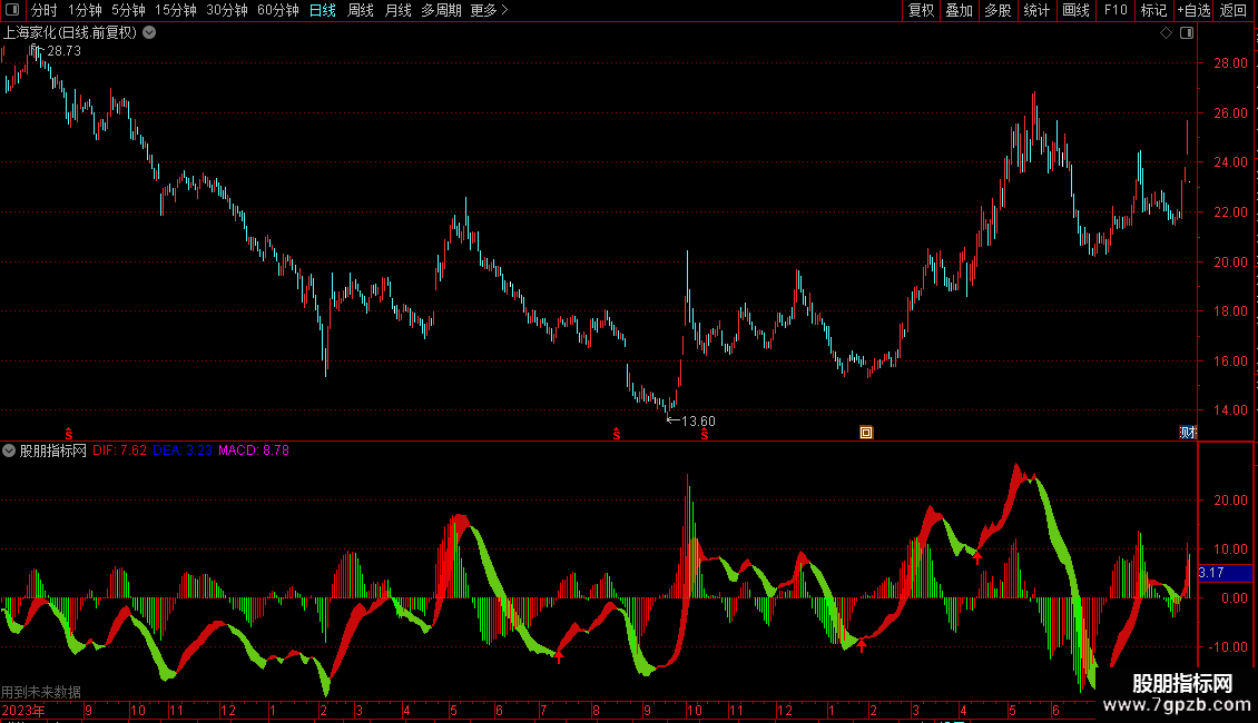 3、副图柱状线颜色战术:零轴下绿转红:轻仓介入零轴上连续红:加仓持有零轴上红转绿:减仓锁定零轴下连续绿:空仓观望