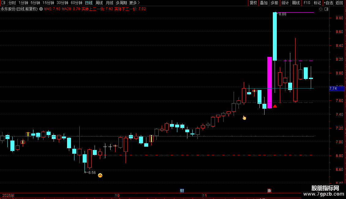 实体下三一价:MIN(OPEN,CLOSE)+ABS(OPEN-CLOSE)/3,NODRAW,COLORRED;