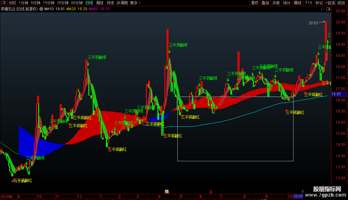 STICKLINE(ZY AND C>=REF(AAA,1),LL,HH,2.3,0),COLOR000099;