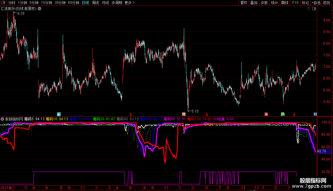 计算95%筹码价格,显示5、10、20、30、40、50、60、120周期筹码占比。