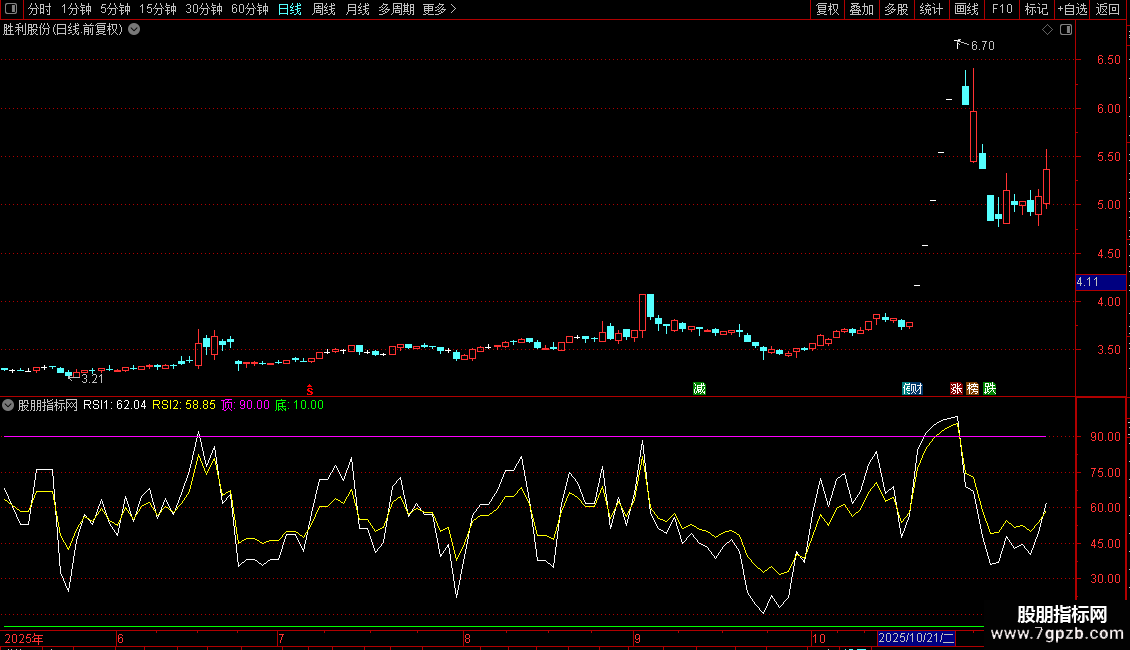 STICKLINE(RSI1-RSI2>30,RSI1,RSI2,1,1)COLORRED;