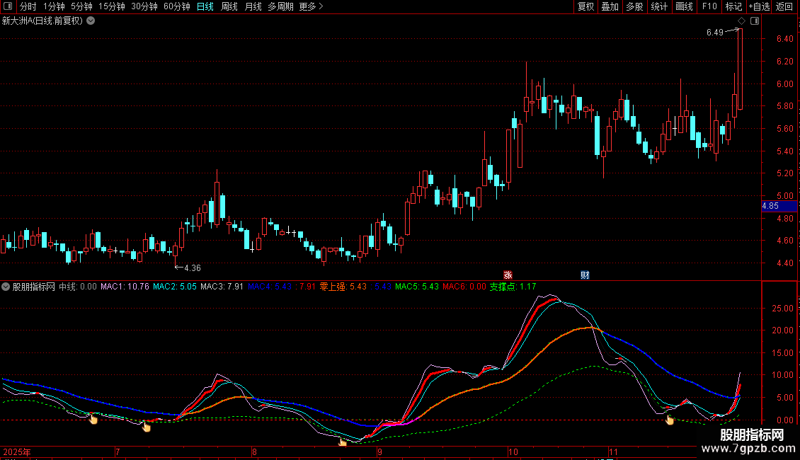 零上强:IF(MAC4>=REF(中线,1),MAC4,DRAWNULL),COLOR0055FF,LINETHICK2;