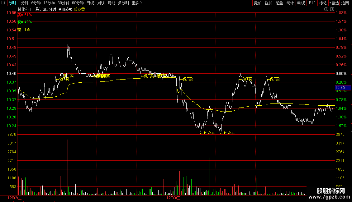 DRAWTEXT((比>1.1 AND 止跌见底< 5),ZRS,'←做T买'),COLORYELLOW;