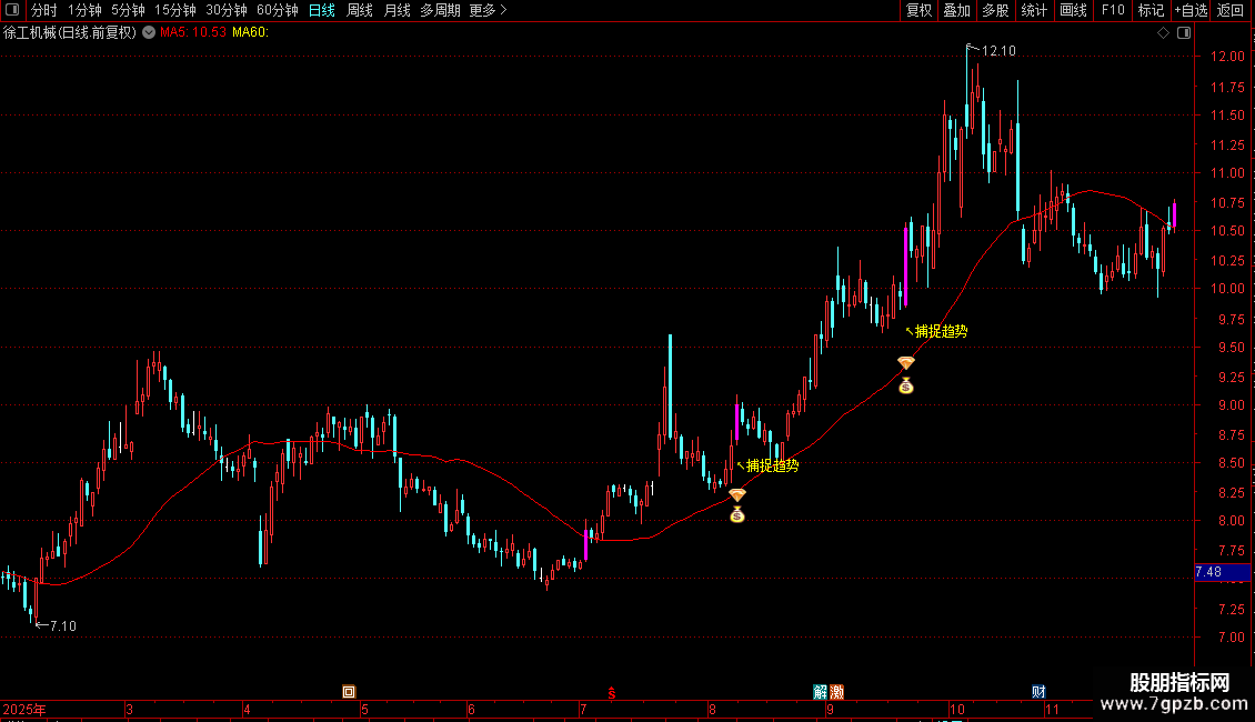 DRAWTEXT(VAR1 AND 捕捉线>REF(捕捉线,1) AND C>捕捉线,L*0.98,'↖捕捉趋势'),COLORYELLOW;