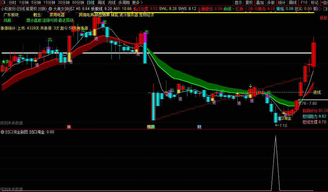 本指标为“大美女颈线突破”包括1主、2副和2选指标分析工具,主要用于识别个股关键颈线位置的突破信号,并辅助判断买卖时机。其核心功能包括:自动绘制不同周期的颈线及支撑压力线,当价格放量突破白色“妖股线”或黄色颈线时,会标记“妖股”或“突破颈线”提示,为趋势启动提供参考。同时,指标结合成交量、跌幅等条件,在特定回调位置捕捉“凹口淘金”等低吸机会,并设有“绝对底部”、“全军出击”等多元买点预警。此外,它还整合了短线支撑阻力位显示、机构评分、涨停统计等实用信息,帮助投资者综合把握股价强弱与结构,适用于趋势跟踪和突破交易的辅助决策。