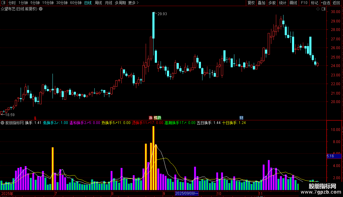 STICKLINE(换手>5 AND 换手<11,0,换手,0.3,0)COLOR00FFFF;