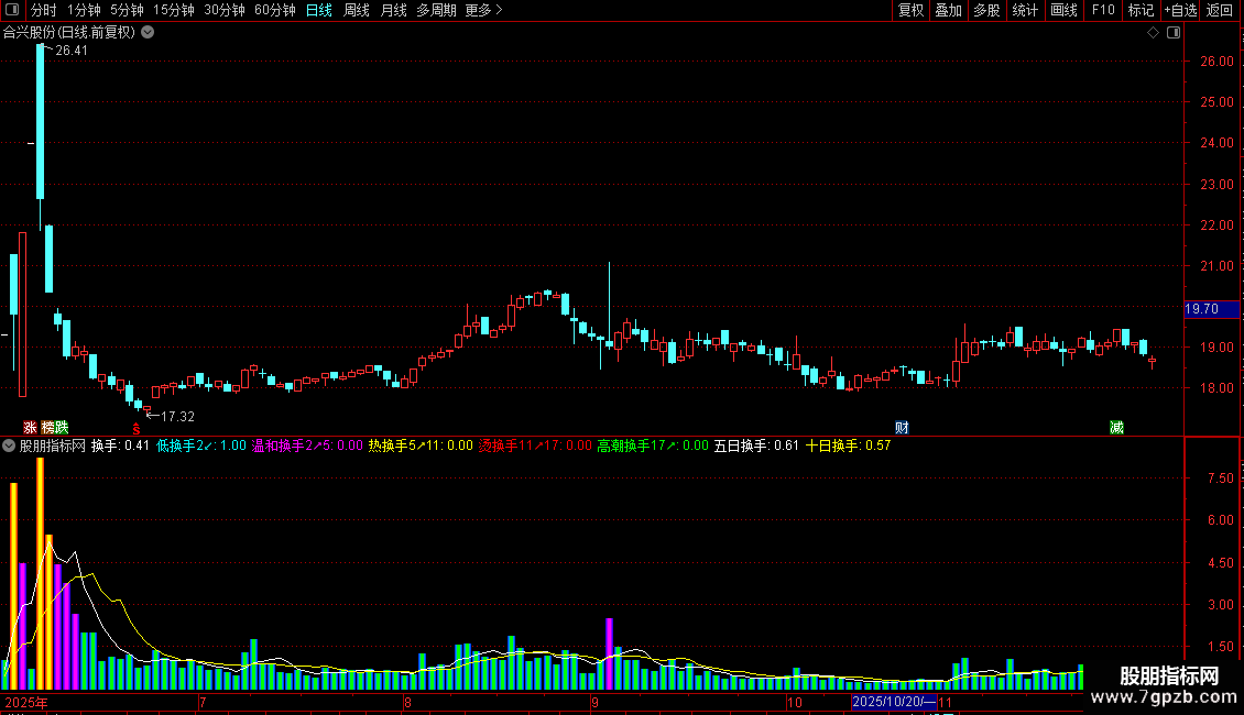 当满足条件换手>17时,在0和换手位置之间画柱状线,宽度为1.3,0不为0则画空心柱.,COLOR00A600