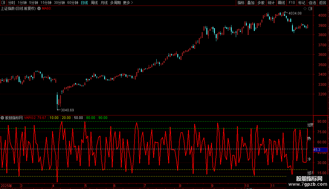 DRAWTEXT(CURRBARSCOUNT=1,15,'过冷'),COLORWHITE;
