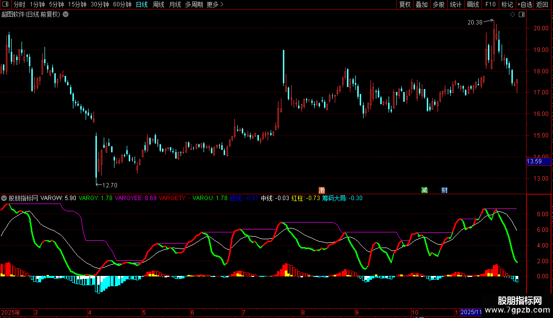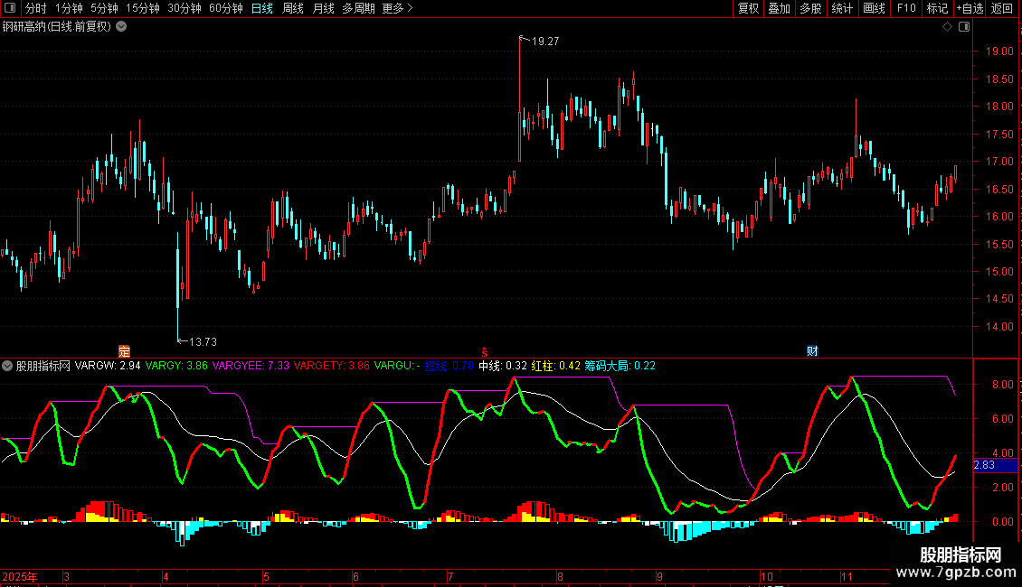 计算短期波动(VARGY)和长期趋势(筹码大局),并用颜色区分上升和下降趋势。