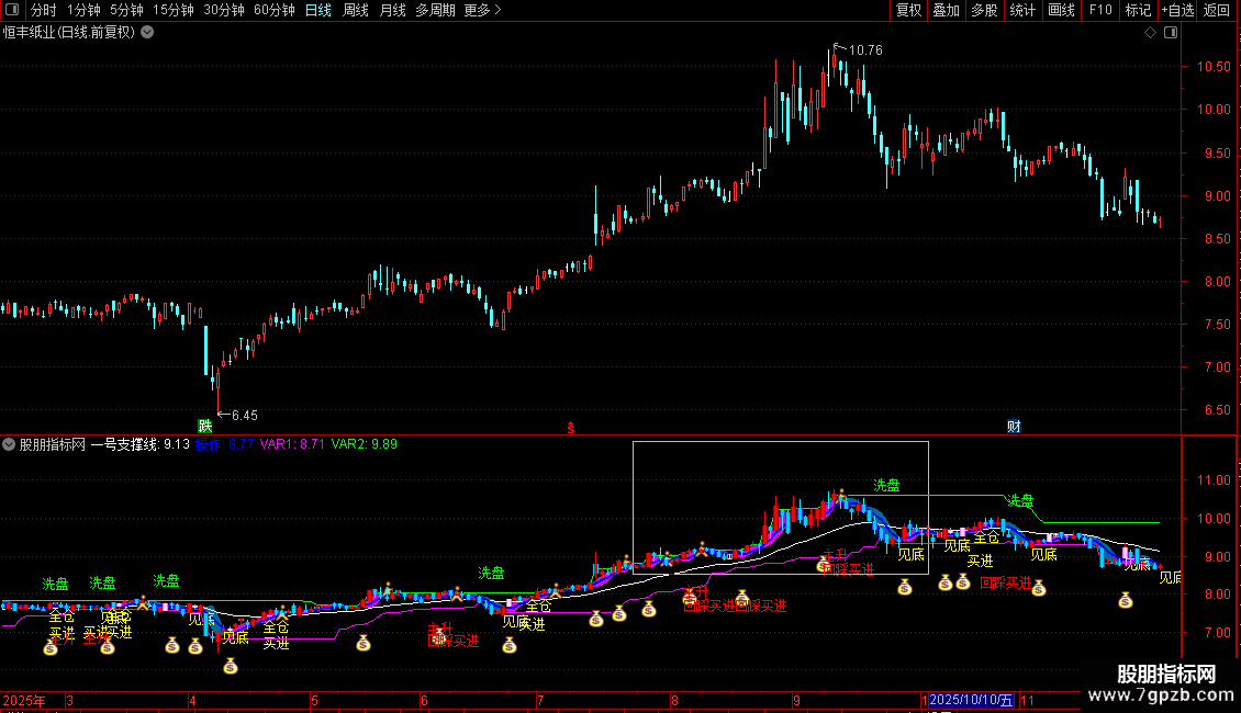 当满足条件收盘价>OPENAND操作>上线AND上线>一号支撑线1AND一号支撑线1>一号支撑线ANDCROSS(上线1,操作)ANDLOW>VAR1ANDJ<90时,在最低价*0.86位置书写文字,画红色