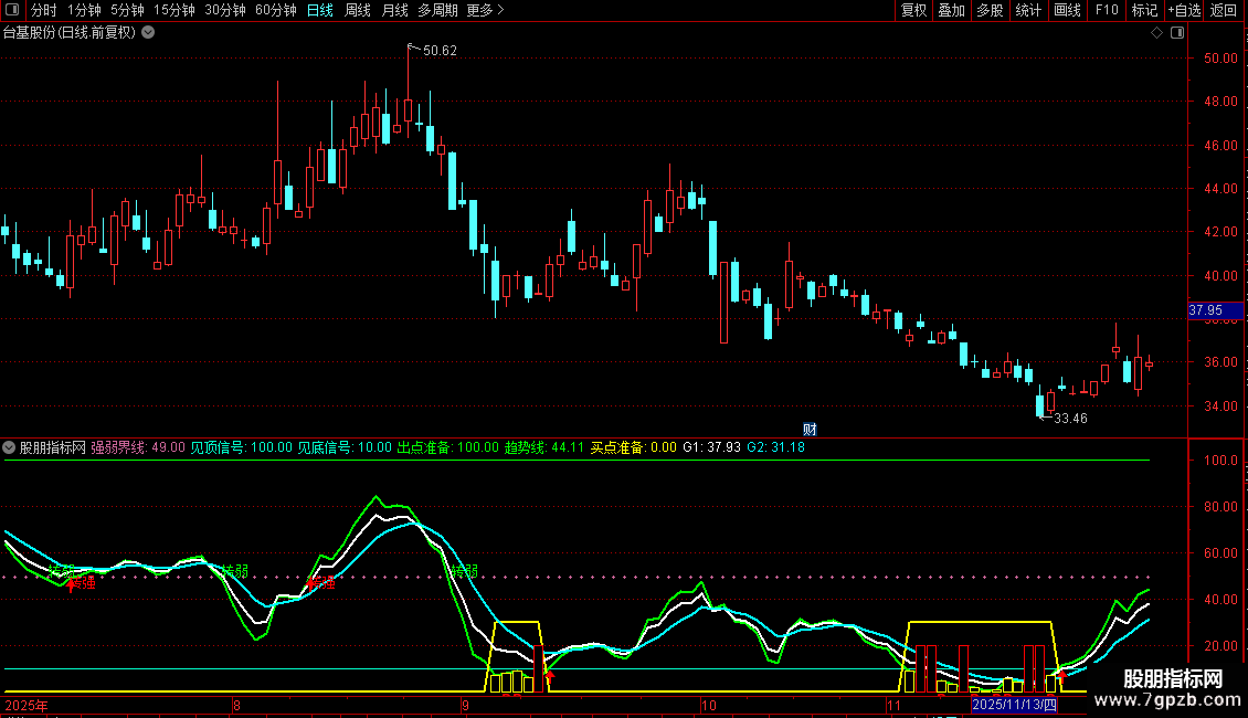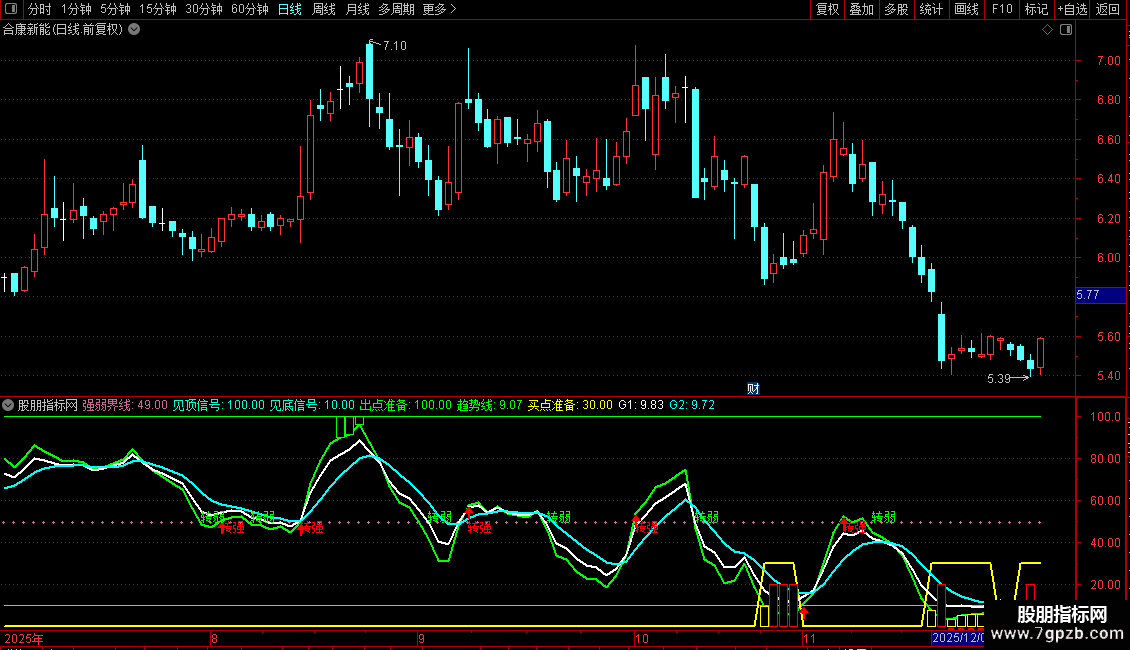 DRAWTEXT(CROSS(49,趋势线),52,'转弱'),COLORGREEN;