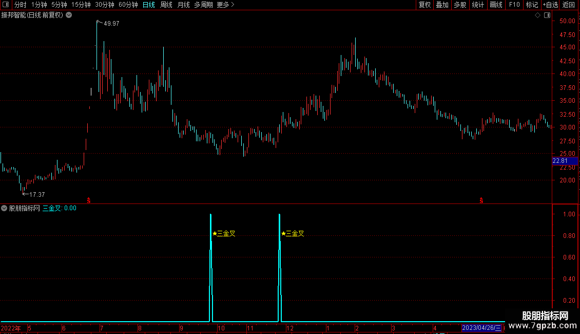 1.三金叉指标是将最基础的三个指标,均线、KDJ与MACD同时金叉作为依据,也是趋势运行的关键位置,规避了单一指标在上升趋势中的钝化的现象。