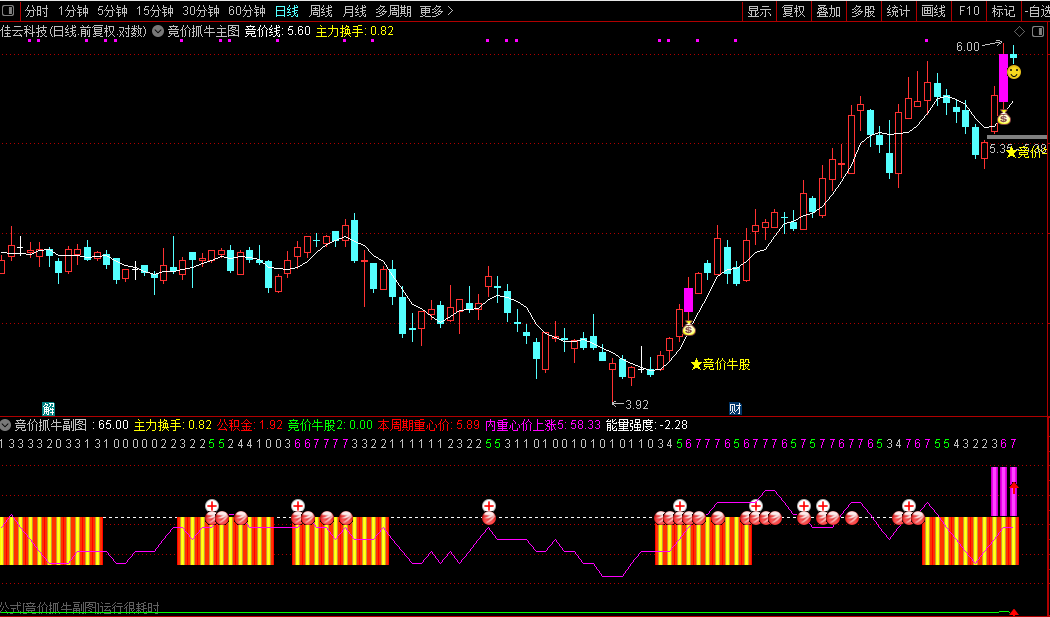 2. 优先选择同时出现红色/紫色柱、XJ≥5的个股;