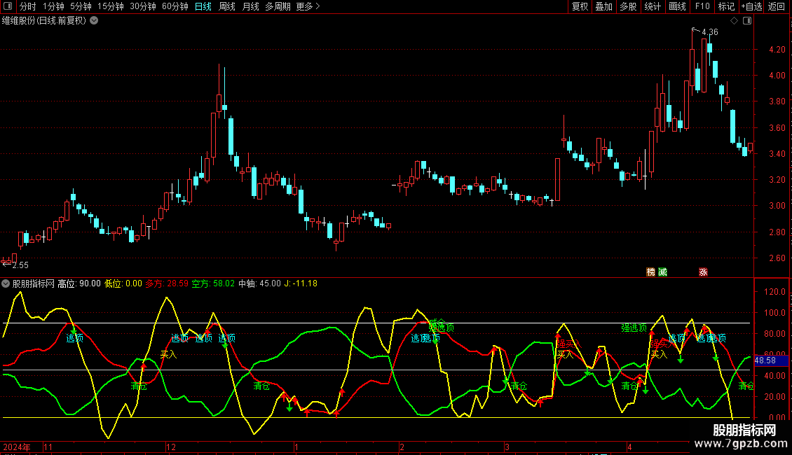DRAWTEXT(CROSS(45,多方),30,'清仓'),COLORGREEN;