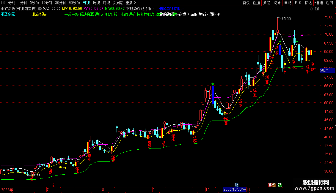 低点:IF(CURRBARSCOUNT<=60, CONST(IF(ISLASTBAR=1,LLV(L, BARSLAST(CURRBARSCOUNT=60)),1)),DRAWNULL),COLORMAGENTA,DOTLINE;