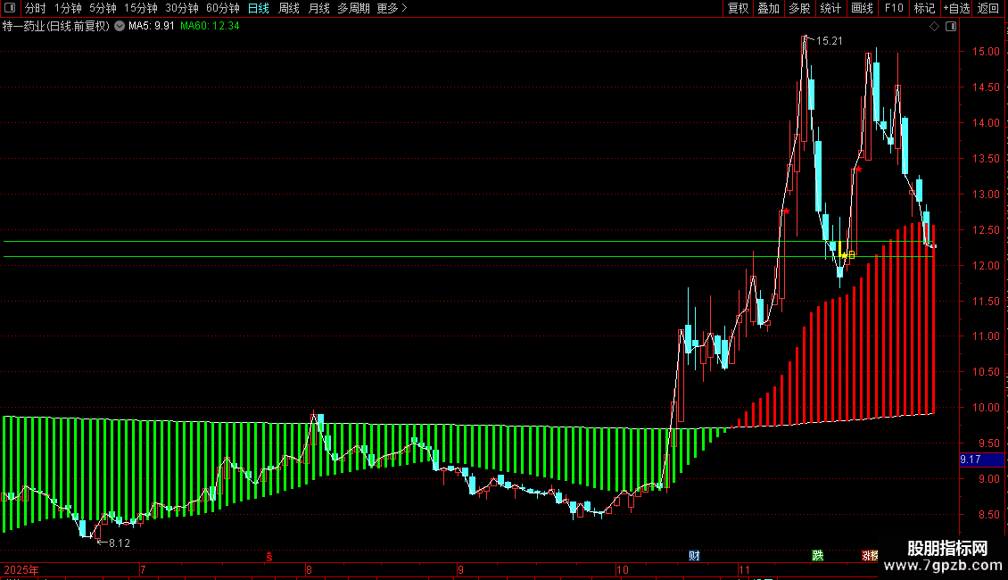 STICKLINE((MA30<强弱),MA30,强弱,1,0),COLOR00FF00;
