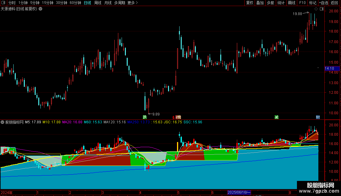IF(MA60>=REF(MA60,1),MA60,DRAWNULL),COLOR00FFFF,LINETHICK2;