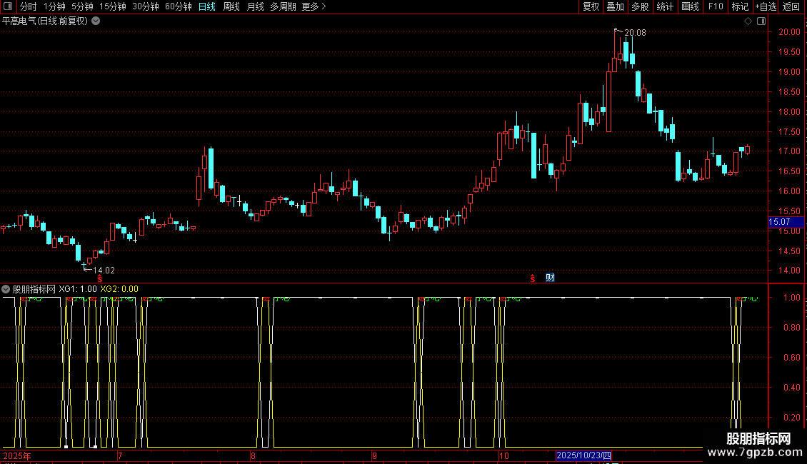 当满足条件XG2上穿XG1时,在XG2位置书写文字画红色