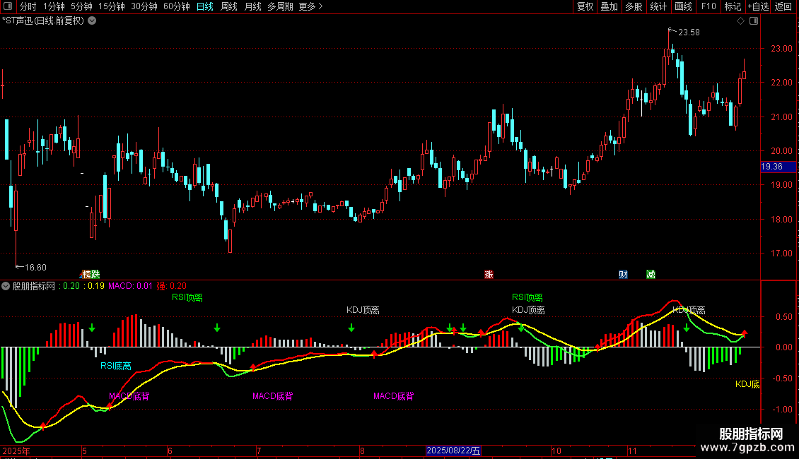 DRAWTEXT(D1>0,0.4,'MACD顶离'),COLORBLUE;{MACD顶背离}