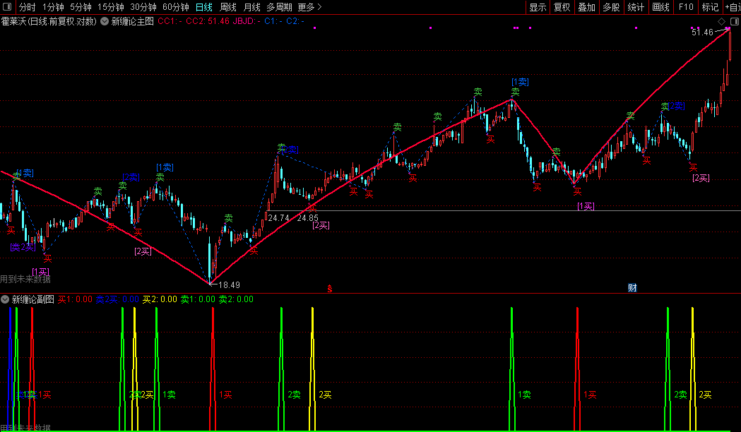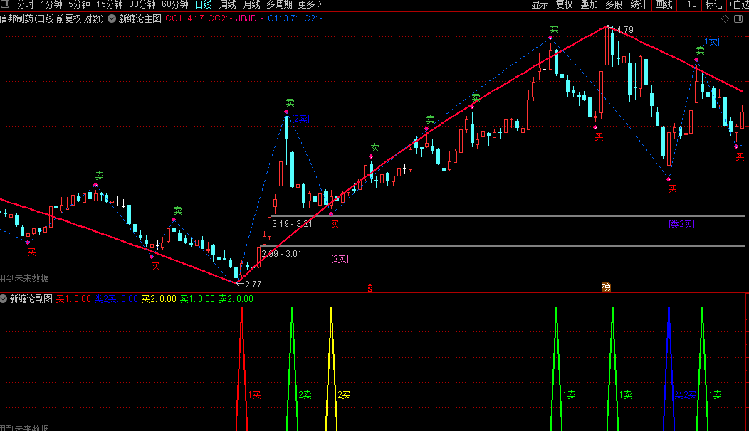 本工具为“新缠论波段指标”,包含1个主图指标、1个副图指标及3个选股指标,专注于识别股价波段结构中的关键买卖点。其核心在于通过自动划分趋势线段,结合背驰、中枢震荡等缠论逻辑,实时标注“买”“卖”信号,并具体指示“类二买”“二买”“一卖”等交易位置,辅助判断趋势转折。