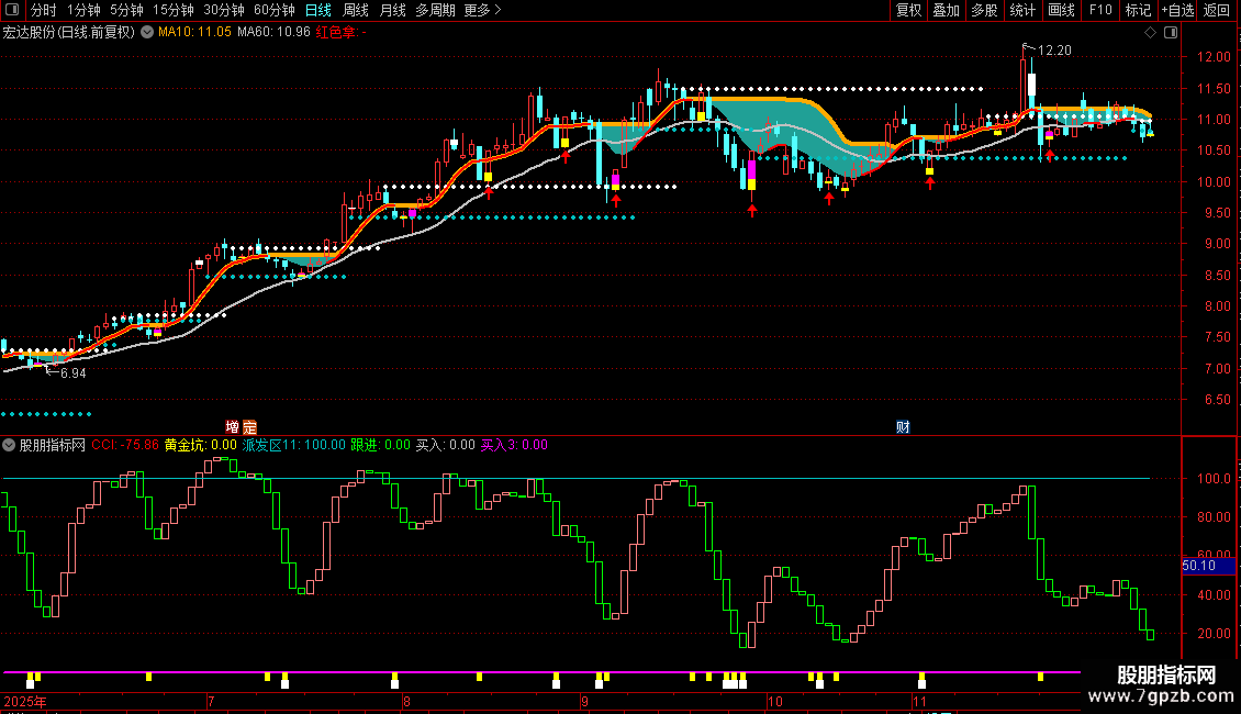 股价启动在即:=IF(CROSS(趋势线,6),50,0),COLORYELLOW;
