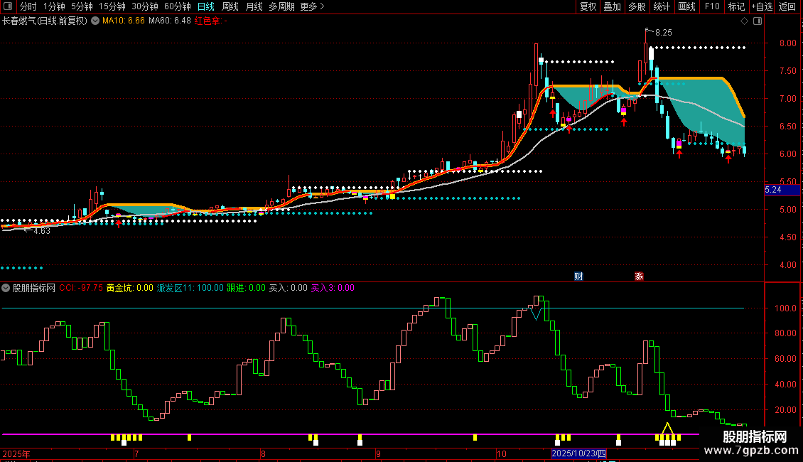 黄金坑:IF(短期5日乖离率<-100,10,0),COLORYELLOW,LINETHICK2;