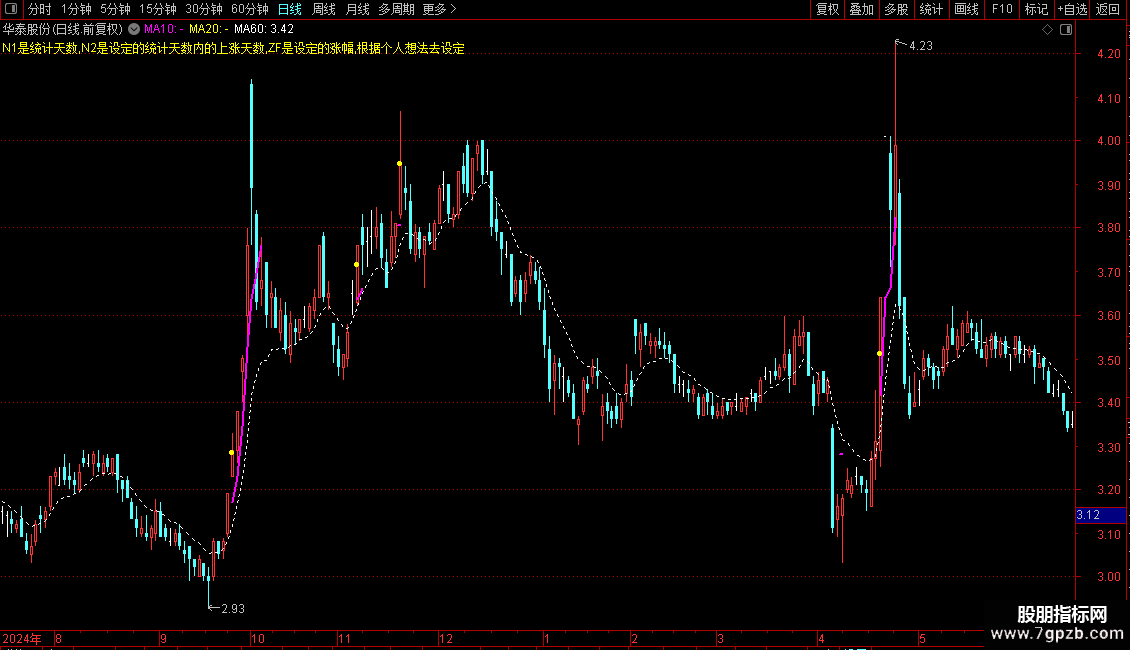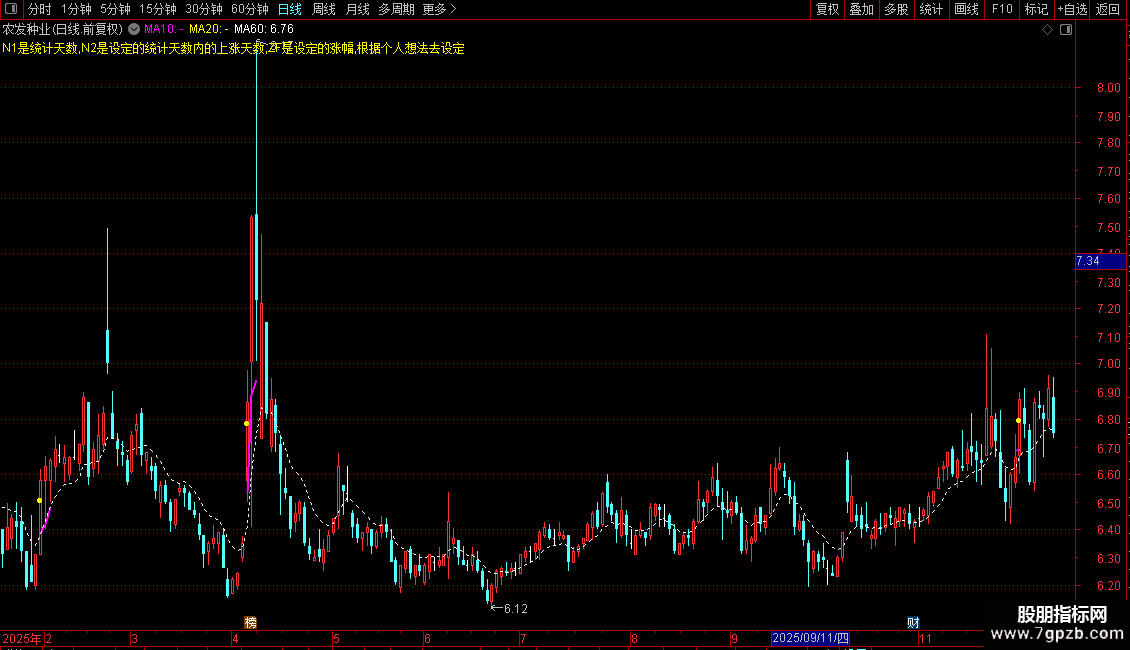 DRAWTEXT_FIX(1,0,0.0 ,0,'N1是统计天数,N2是设定的统计天数内的上涨天数,ZF是设定的涨幅,根据个人想法去设定'),COLORYELLOW;