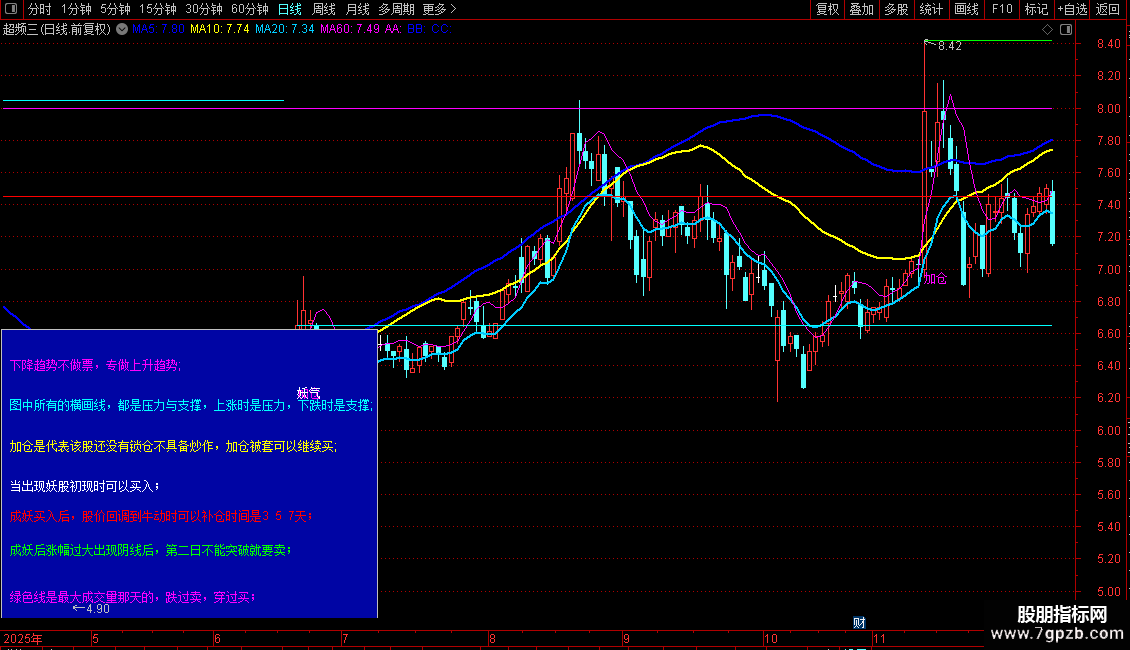 DRAWTEXT_FIX(1,0.008,0.81,0,'成妖买入后,股价回调到牛动时可以补仓时间是3 5 7天;'),COLORRED;